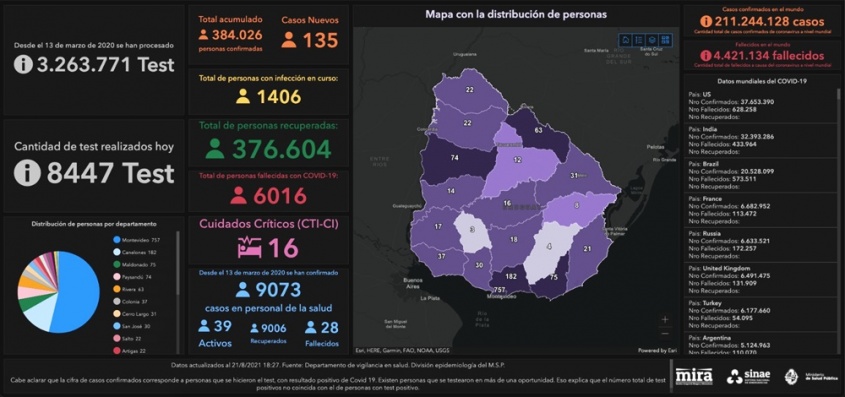 De acuerdo a la información proporcionada por el Ministerio de Salud Pública (MSP), hoy se llevaron a cabo 8.447 análisis y se detectaron 135 nuevos casos de Coronavirus COVID-19.