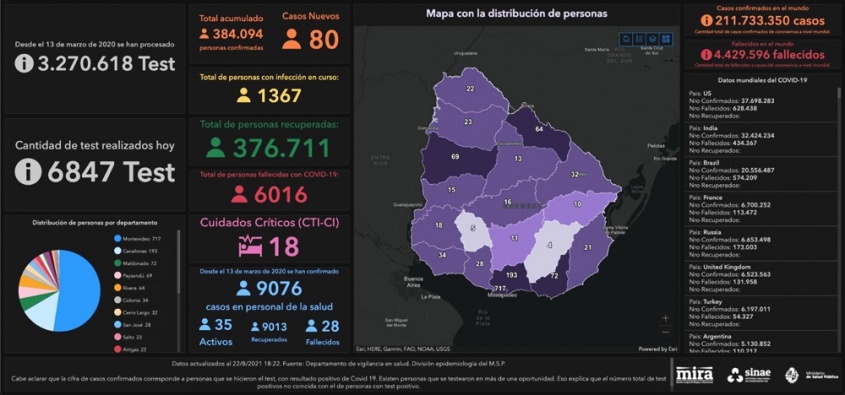 De los 80 nuevos casos, 39 son de Montevideo, 19 de Canelones, 5 de Maldonado, 3 de Cerro Largo, 2 de Artigas, 2 de Rivera, 2 de Rocha, 2 de Tacuarembó, 2 de Treinta y Tres, 1 de Paysandú, 1 de Río Negro, 1 de Salto y 1 de Soriano.