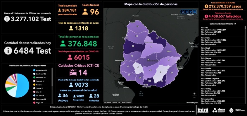De los 96 nuevos casos, 51 son de Montevideo, 10 de Canelones, 9 de Colonia, 8 de Salto, 3 de Paysandú, 3 de Rivera, 3 de San José, 2 de Artigas, 2 de Maldonado, 2 de Rocha, 1 de Cerro Largo, 1 de Durazno y 1 de Tacuarembó.