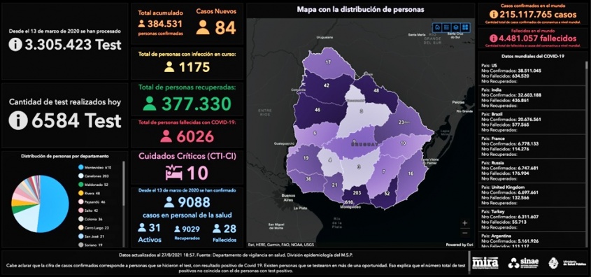 De los 84 nuevos casos, 39 son de Montevideo, 18 de Canelones, 4 de Paysandú, 4 de Salto, 3 de Cerro Largo, 3 de Colonia, 3 de Rivera, 3 de Treinta y Tres, 2 de Artigas, 1 de Florida, 1 de Lavalleja, 1 de Rocha, 1 de San José y 1 de Soriano.