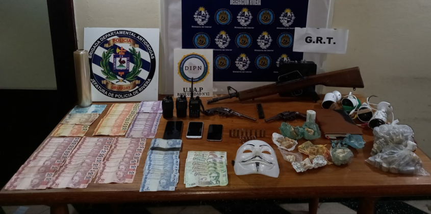 También se incautaron tres equipos de comunicación (handy), 2.130 pesos, 1.440 reales, once envoltorios de sustancias, tres dosis de pasta base y tres celulares.