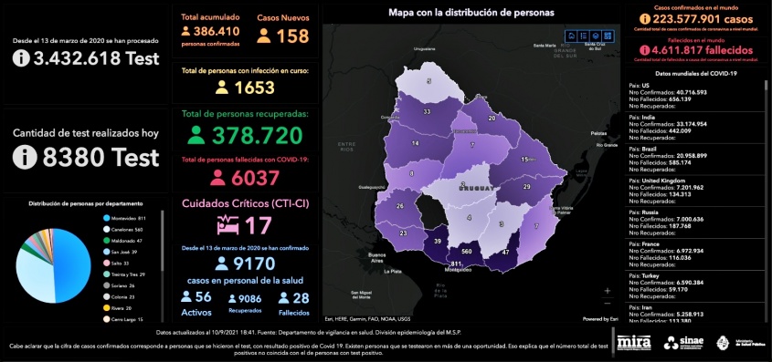 De acuerdo a la información proporcionada por el Ministerio de Salud Pública (MSP), hoy se llevaron a cabo 8.380 análisis y se detectaron 158 nuevos casos de Coronavirus COVID-19.