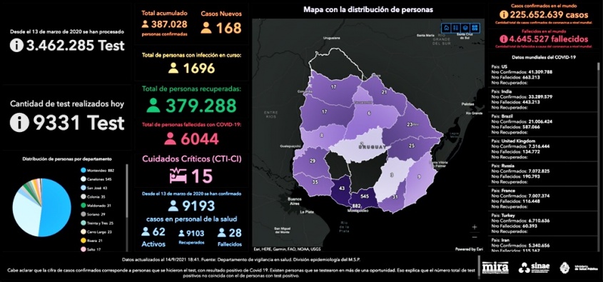 De acuerdo con la información proporcionada por el Ministerio de Salud Pública (MSP), hoy se llevaron a cabo 9.331 análisis y se detectaron 168 nuevos casos de Coronavirus COVID-19.