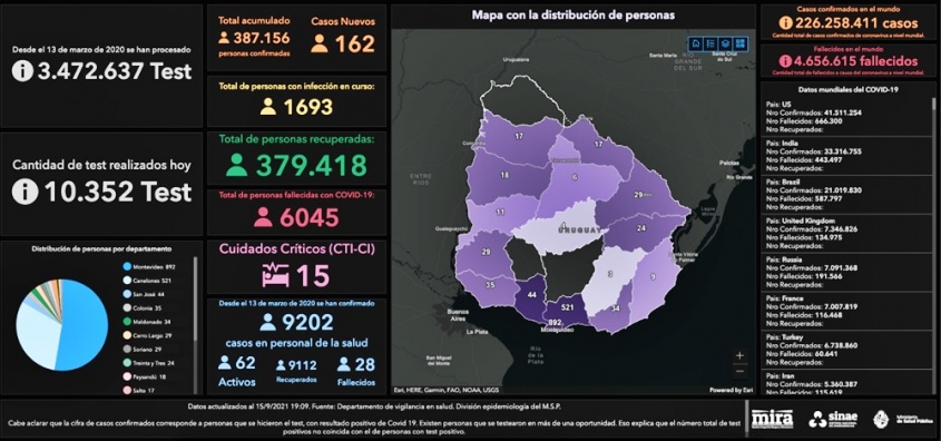 De acuerdo con la información proporcionada por el Ministerio de Salud Pública (MSP), hoy se llevaron a cabo 10.352 análisis y se detectaron 162 nuevos casos de Coronavirus COVID-19.