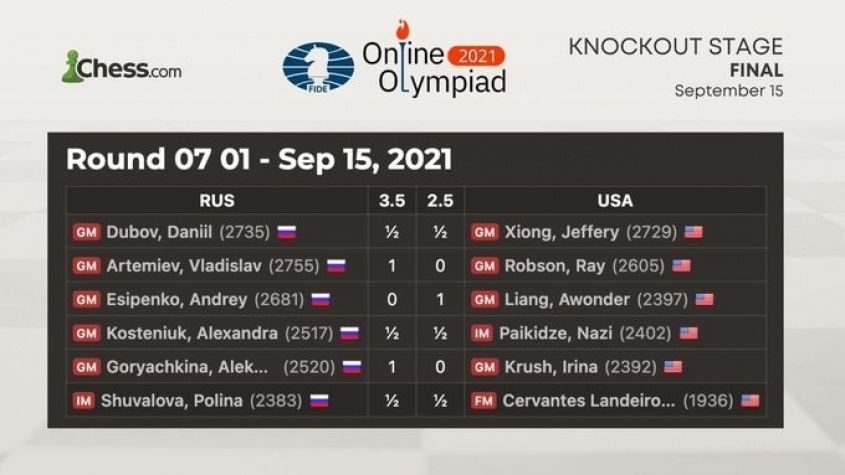 El equipo de Rusia se llevó la medalla de oro en la Olimpiada en línea de la FIDE 2021, después de derrotar a EE. UU. (Plata) por un doble 3.5-2.5 en el servidor de juego en línea de Chess.com.