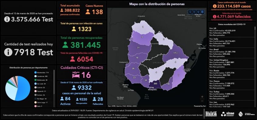De acuerdo a la información proporcionada por el Ministerio de Salud Pública (MSP), hoy se llevaron a cabo 7.918 análisis y se detectaron 138 nuevos casos de la COVID-19.