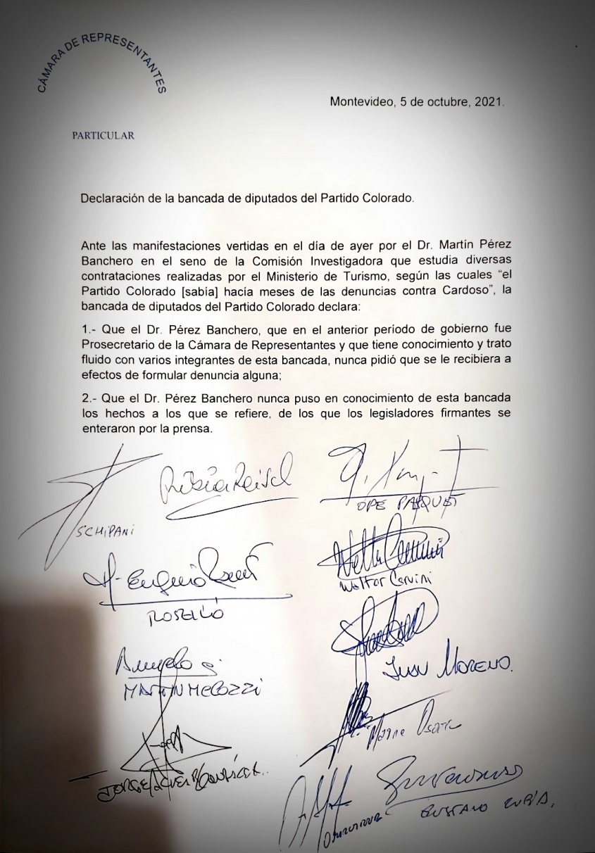 Las declaraciones del exdirector nacional de Turismo Martín Pérez Banchero había indicado tras comparecer en la comisión investigadora del Ministerio de Turismo, que su colectividad política estaba informada de las irregularidades en esa cartera "hace meses", e incluso apuntó: “(El expresidente Julio María) Sanguinetti nos tenía que haber escuchado”.