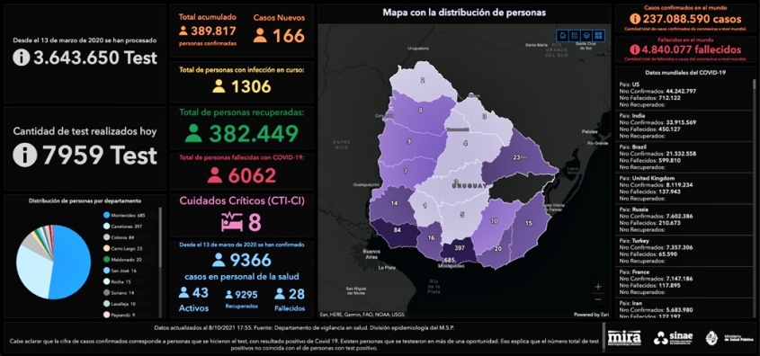 De acuerdo a la información proporcionada por el Ministerio de Salud Pública (MSP), hoy se llevaron a cabo 7.959 análisis y se detectaron 166 nuevos casos de COVID-19.