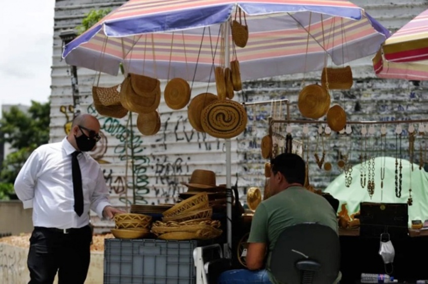 En portada, fotografía archivo, tomada en diciembre de 2020, en la que se registró a un transeúnte al observar las artesanías de un solitario vendedor ambulante, en Sao Paulo (Brasil). EFE/Fernando Bizerra