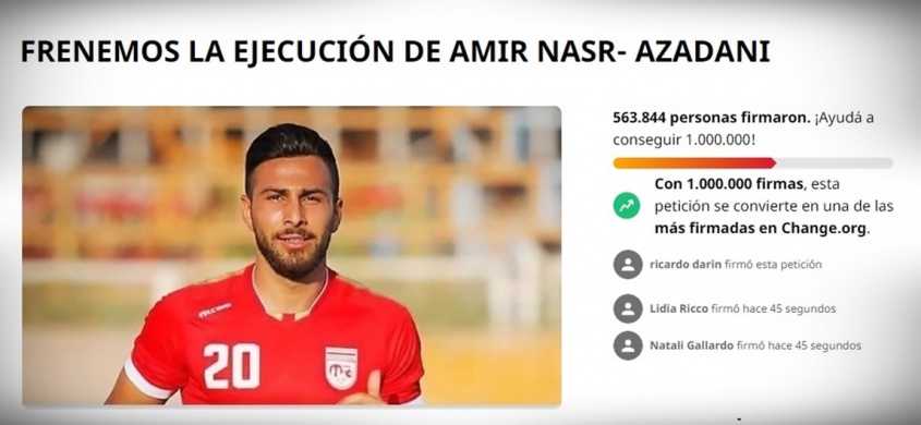 “El futbolista iraní Amir Nasr-Azadani podría ser ejecutado. Según 'Iranwire', Amir Nasr-Azadani, de 26 años, fue condenado a muerte por "traición a la patria" después de mostrar su apoyo a los derechos humanos y defender los derechos de la mujer en su país”, dice la petición.
