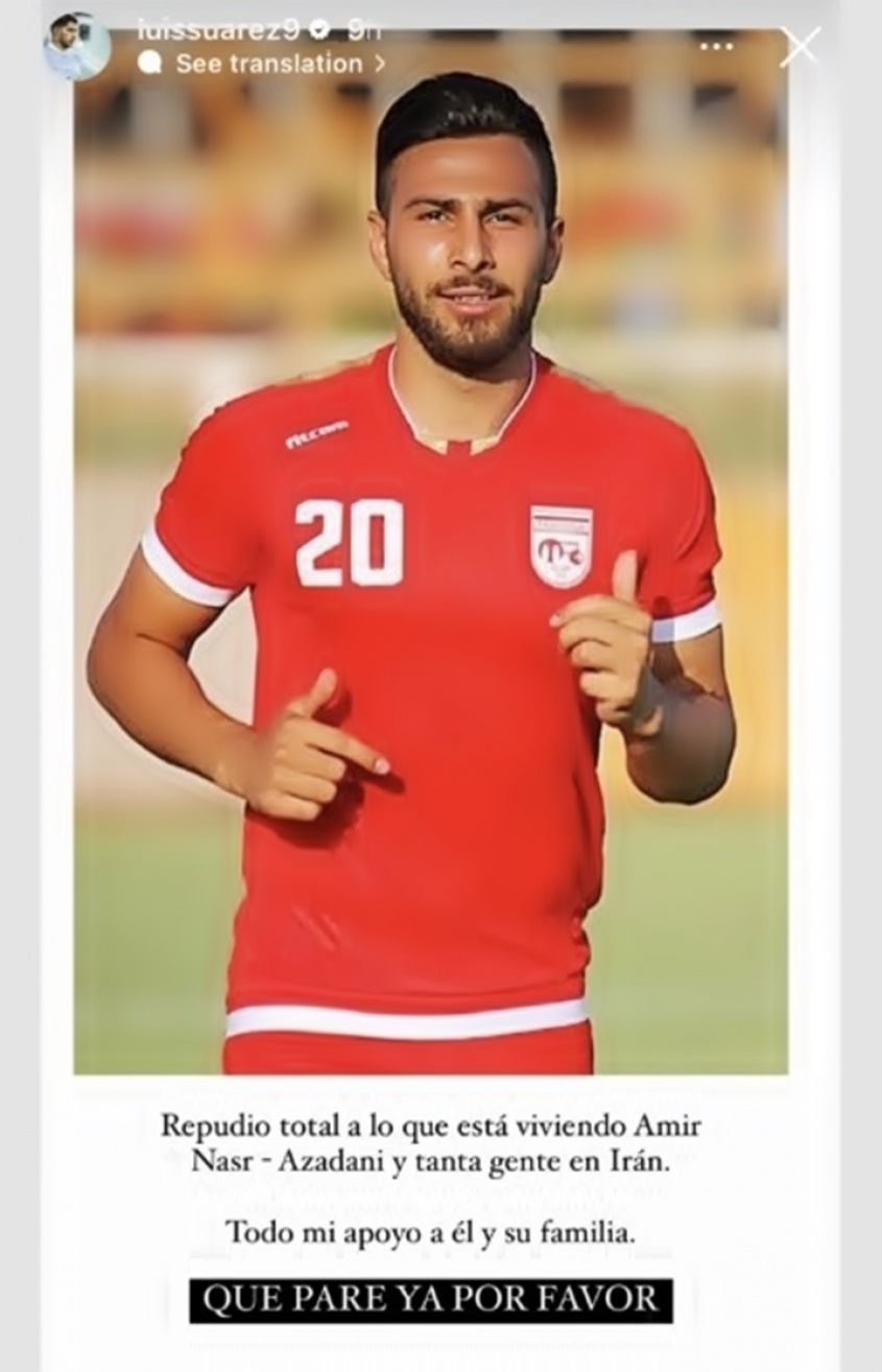 "Repudio total a lo que está viviendo Amirr Nasr-Azadani y tanta gente en Irán. Todo mi apoyo a él y su familia", escribió el goleador y concluyó: "Que pare ya por favor".