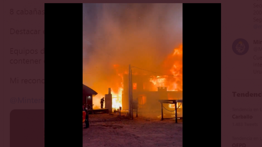 El director de Seguridad y Convicencia del Ministerio de Interior Santiago Gonzalez que estaba en el lugar escribio en redes sociales que "a las 5 am tuvimos un incendio en la playa del ribero, en Punta del Diablo, con 8 cabañas con pérdidas totales"