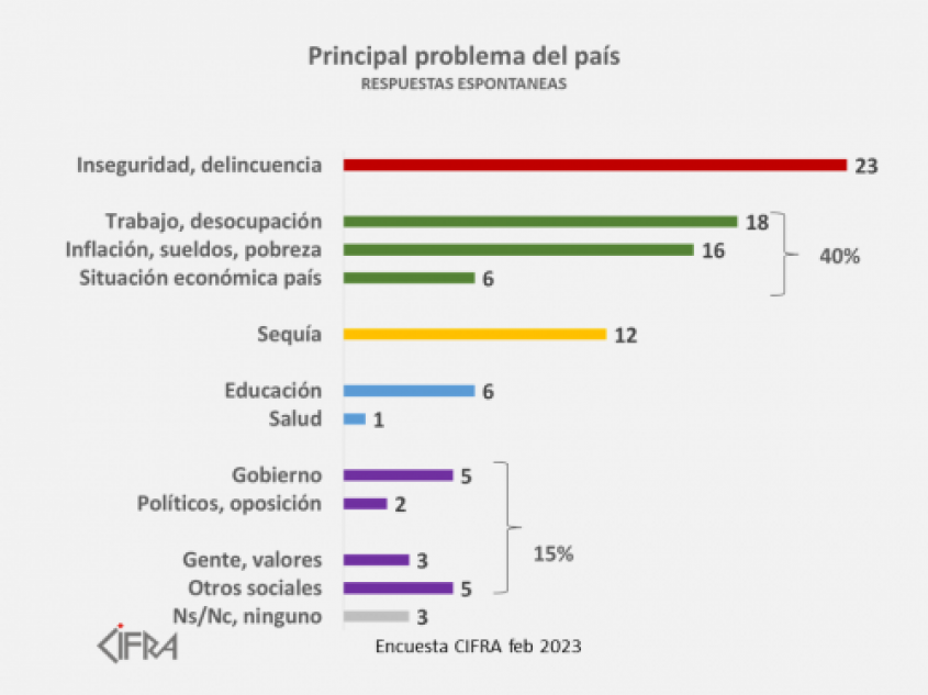 Más de un quinto sigue más preocupado por la inseguridad y el 15% por problemas vinculados a la política y la sociedad. Todos los otros problemas son mencionados espontáneamente por pequeñas minorías.