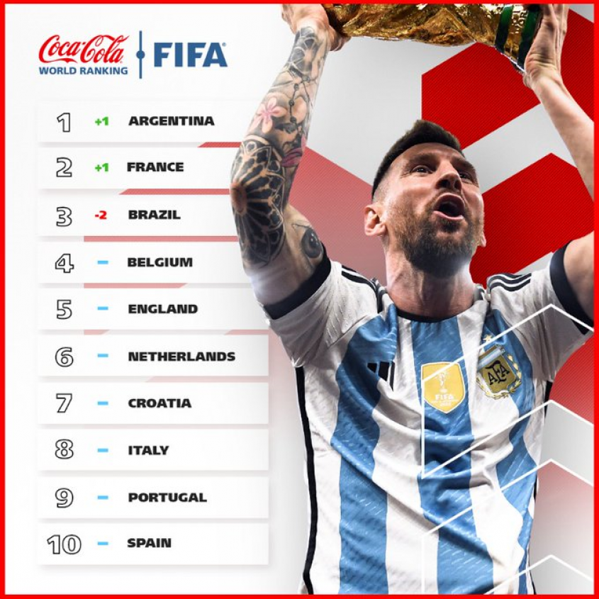 La selección argentina, vigente campeona del mundo tras coronarse en Qatar, es nueva líder del ranking FIFA seis años después, tras arrebatarle ese primer puesto a Brasil, que baja al tercer lugar, mientras que la selección española mantiene su plaza y cierra un ‘Top 10′ sin cambios significativos.