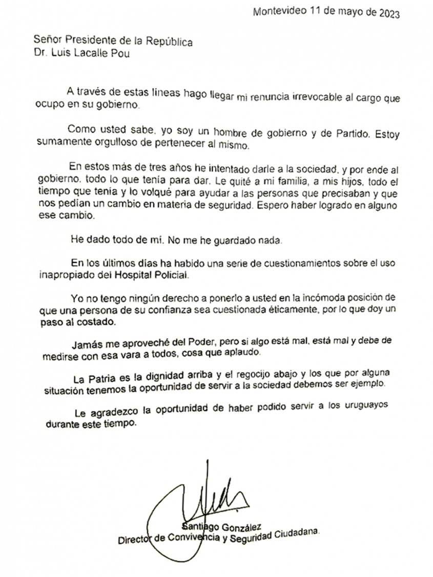 El director de Convivencia y Seguridad Ciudadana del Ministerio del Interior, Santiago González, renunció a su cargo al frente de la cartera tras la polémica que se generó en torno a la atención que recibió en el Hospital Policial.