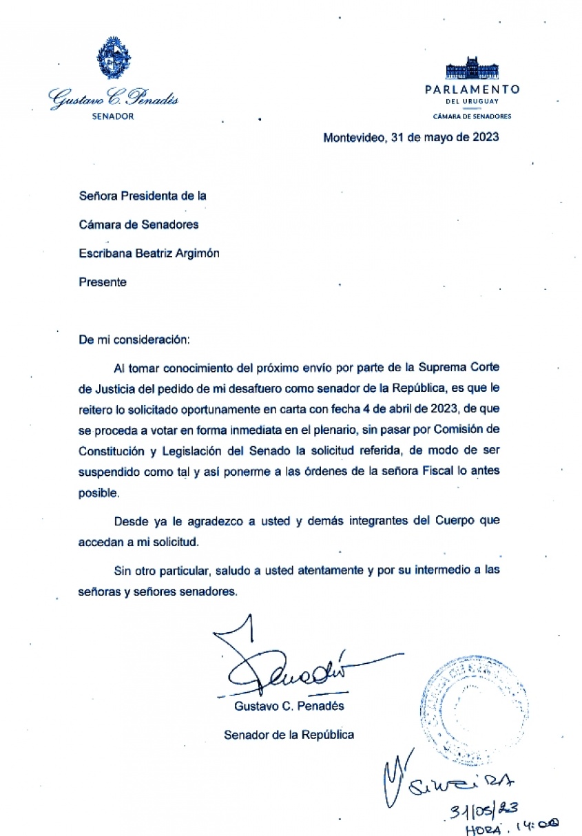 Este miércoles, Penadés pidió en una carta dirigida a la vicepresidenta de la República y presidenta de la Cámara de Senadores, Beatriz Argimón, que el desafuero “se proceda a votar en forma inmediata en el plenario, sin pasar por Comisión de Constitución y Legislación del Senado”. Esto es para que pueda ser suspendido de su puesto como senador y poderse poner “a las órdenes de la fiscal lo antes posible”, afirmó el legislador en el documento que compartimos.