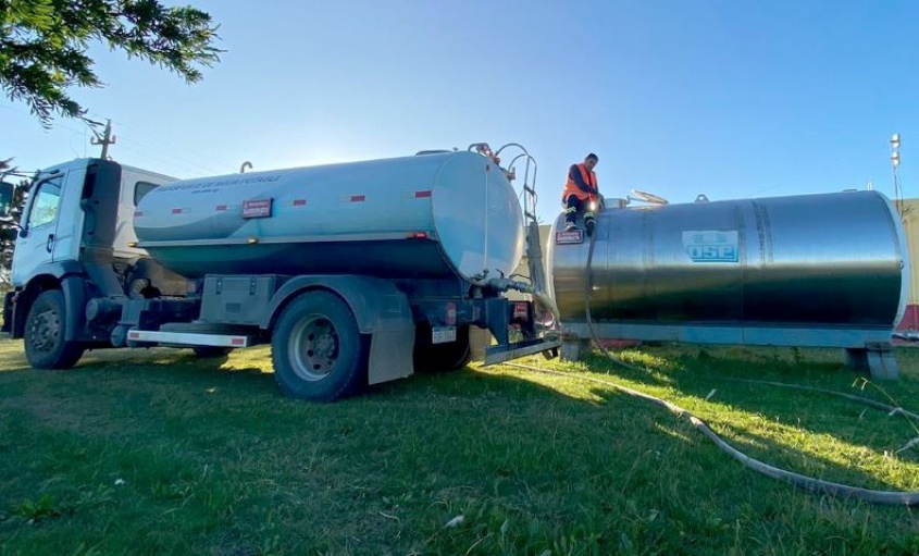 Camiones de 30 mil litros de agua potable cargados en la usina potabilizadora de Costa Azul, llegan a la zona del Estadio Centenario para transferir su contenido a camiones de 8 mil litros, los cuales posteriormente se dirigen a los hospitales y centros sanitarios