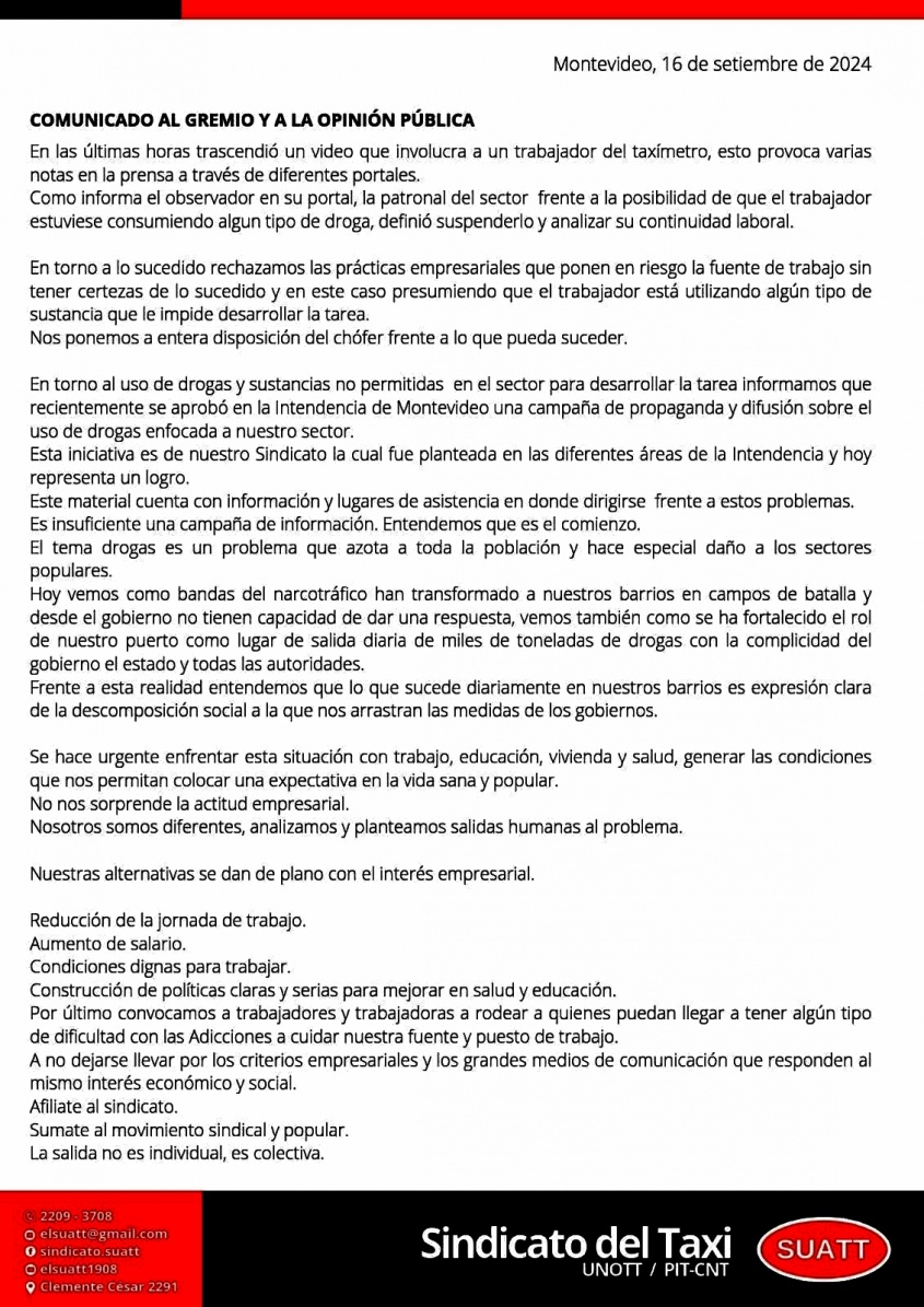 El sindicato del taxi, Suatt, emitió un comunicado en la tarde de este lunes, en el que rechaza la manera en que la gremial del taxi trató el caso del  trabajador, que fue filmado mientras consumía cocaína, a bordo de un vehículo.