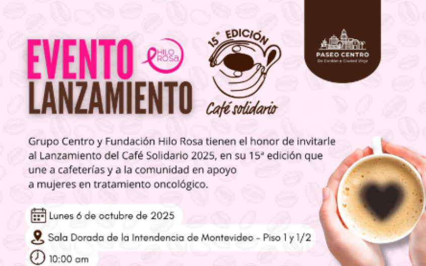 Este año más de 70 bares y cafeterías convocadas por Paseo Centro donarán el 100% de lo recaudado por la venta de café a beneficio de la Fundación Hilo Rosa, una organización sin fines de lucro que brinda acompañamiento emocional, contención y apoyo integral a mujeres que transitan un diagnóstico de cáncer, principalmente de mama, en Uruguay.