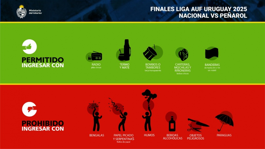 En tanto se permitirá el ingreso de Termo y mate. Carteras, bandoleras, mochilas, bolsos chicos y riñoneras. Bombos, tambores o redoblantes con lonja transparente, según coordinación previa.
