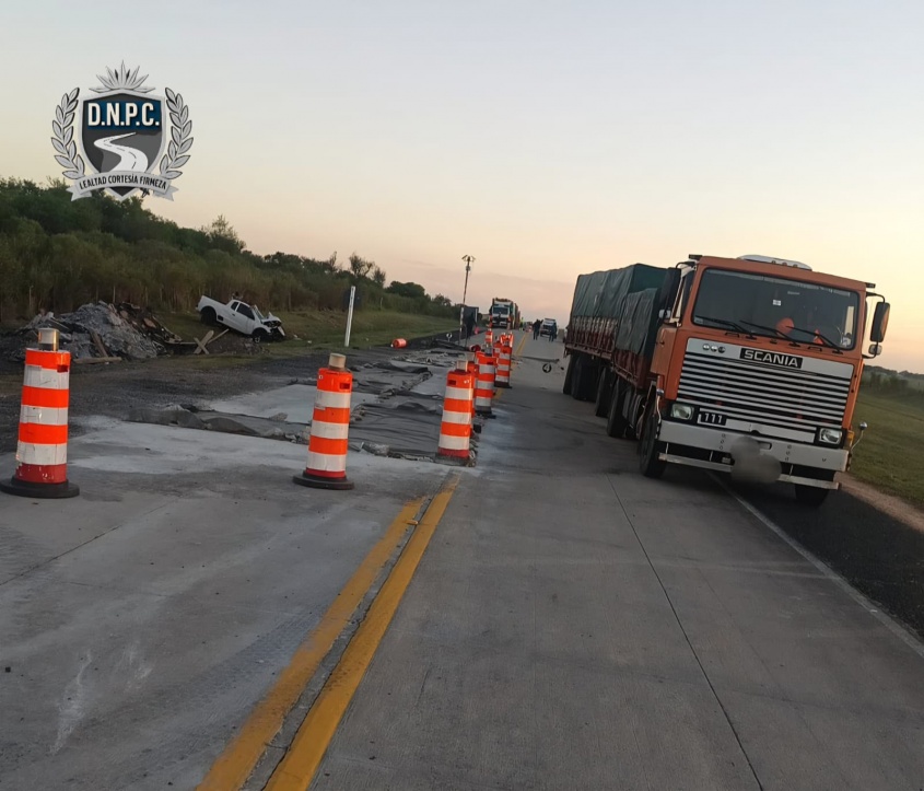 El camión circulaba de Norte a Sur a baja velocidad en un tramo de obras con una única senda habilitada y por causas a determinar es embestido en su parte trasera por una camioneta que lo hacía en el mismo sentido, su conductor fue trasladado hacia Nuevo Berlín tras sufrir una crisis nerviosa.